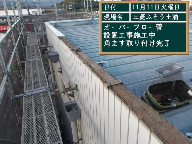三菱ふそう土浦店。大雨が降った際、雨水が捌けきれなくなって建物の中に雨水が溢れて流れ込んできます。オーバーフロー菅を設置して下さい。とのご依頼。直ぐに無料現調にうかがいました。