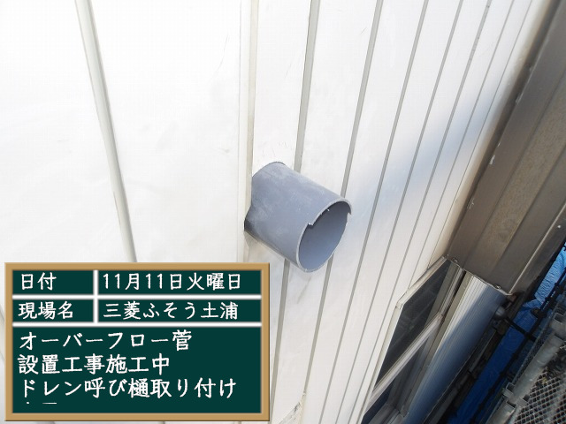 三菱ふそう土浦店。大雨が降った際、雨水が捌けきれなくなって建物の中に雨水が溢れて流れ込んできます。オーバーフロー菅を設置して下さい。とのご依頼。直ぐに無料現調にうかがいました。