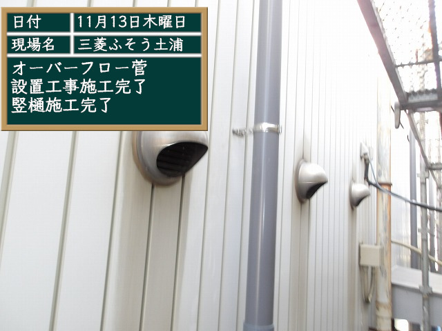 三菱ふそう土浦店。大雨が降った際、雨水が捌けきれなくなって建物の中に雨水が溢れて流れ込んできます。オーバーフロー菅を設置して下さい。とのご依頼。直ぐに無料現調にうかがいました。
