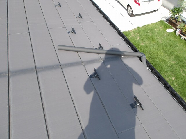龍ヶ崎市 S 様。一階屋根上に有る這樋が外れてしまいました。大雨の時は一階の雨樋に流れ込まないで外に飛び出てしまいます。直して下さい。