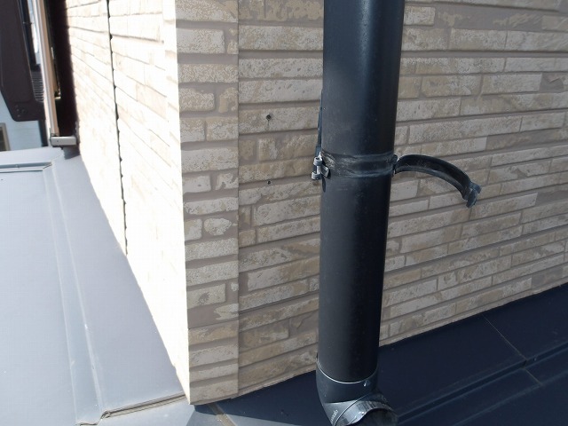 龍ヶ崎市 S 様。一階屋根上に有る這樋が外れてしまいました。大雨の時は一階の雨樋に流れ込まないで外に飛び出てしまいます。直して下さい。